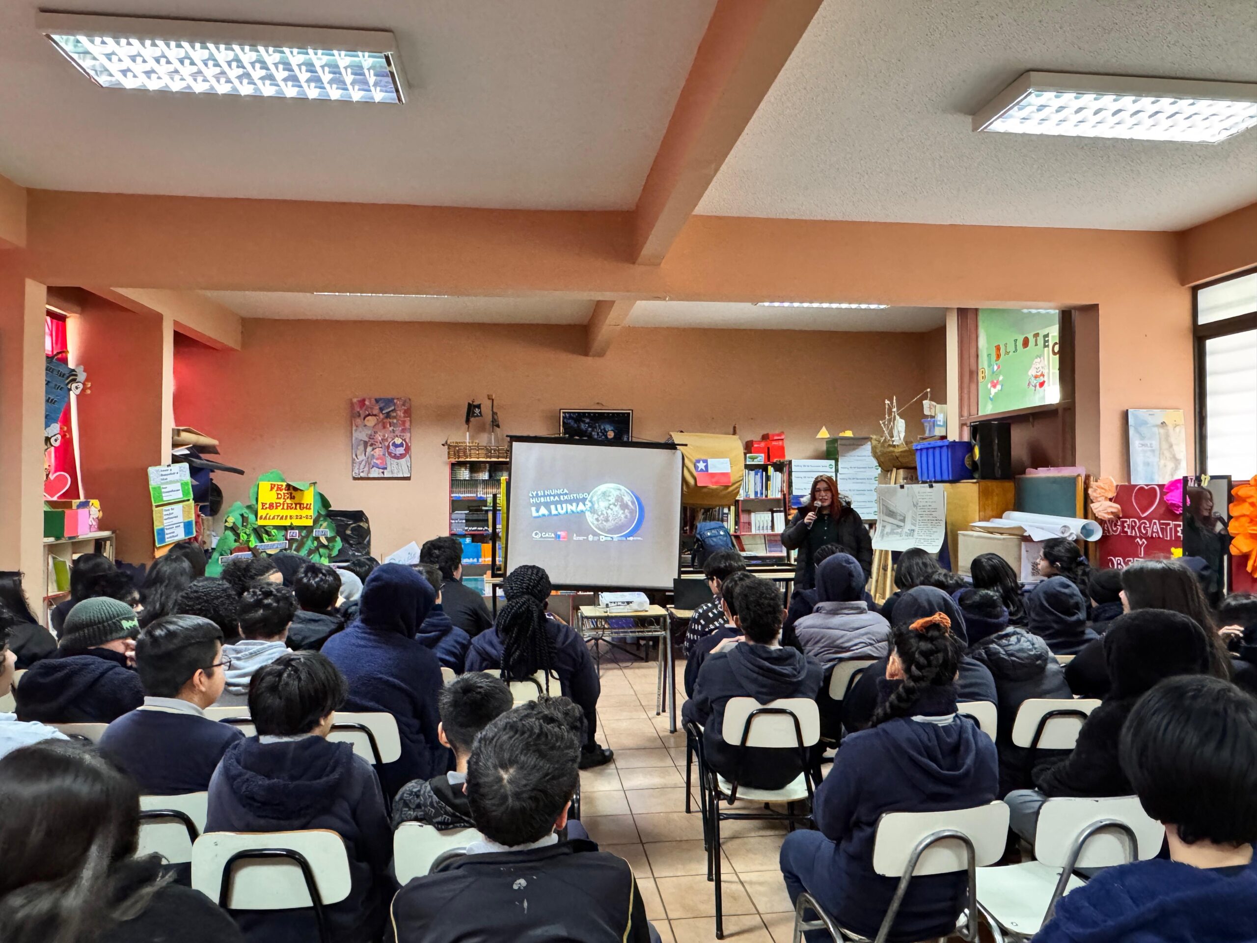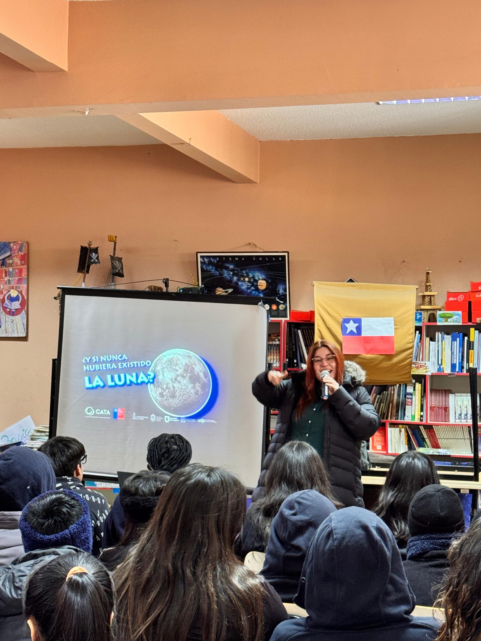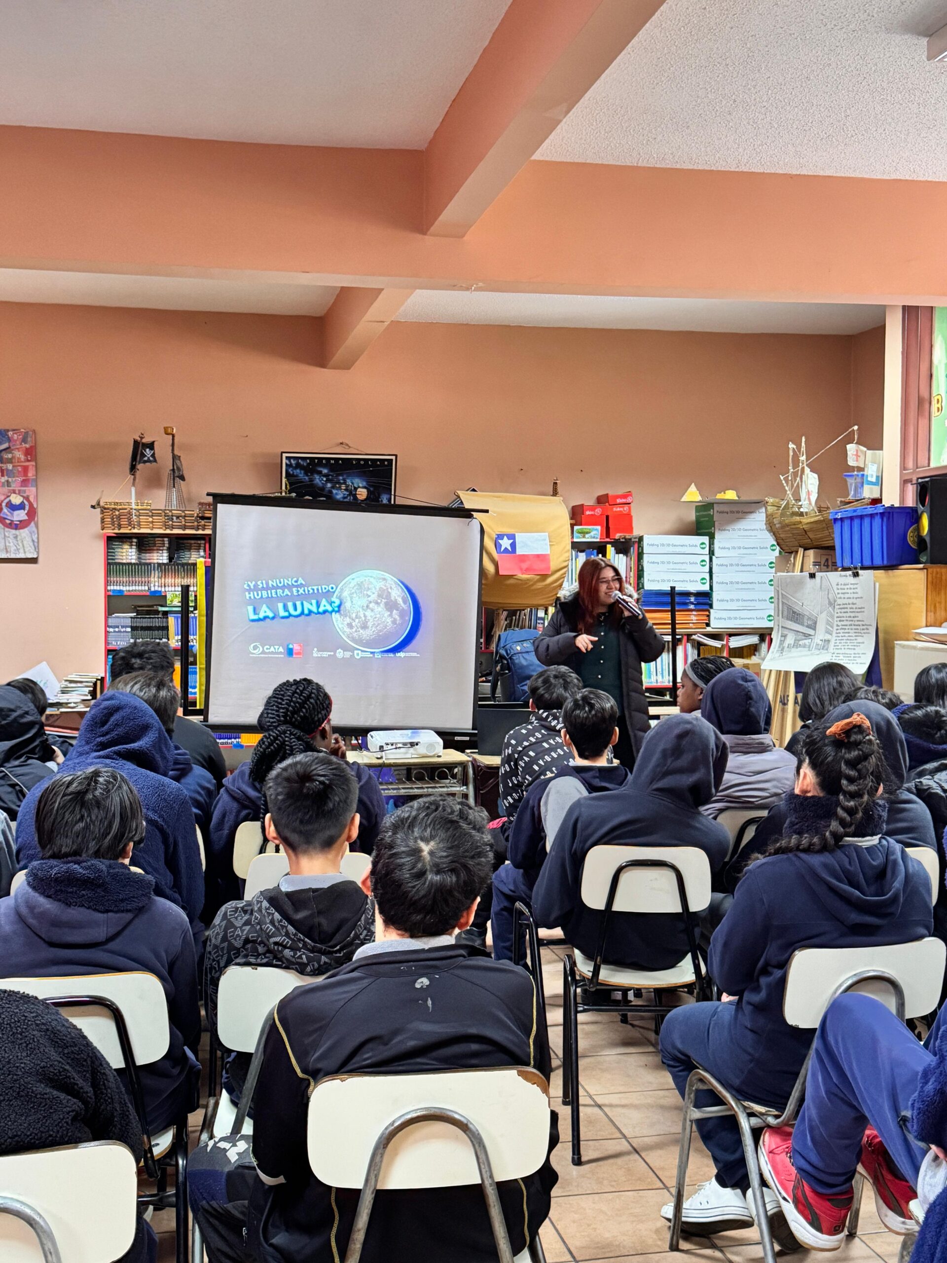En el marco de su programa de divulgación científica, el Centro de Astrofísica y Tecnologías Afines (CATA) realizó la charla “¿Y si nunca hubiera existido la Luna?” en la Escuela El Salitre, ubicada en la comuna de Pudahuel. La actividad estuvo dirigida a estudiantes de enseñanza básica en dos bloques: el primero para alumnos de tercero, cuarto y quinto básico; y el segundo para estudiantes de séptimo y octavo año, logrando convocar a un total de 136 participantes.