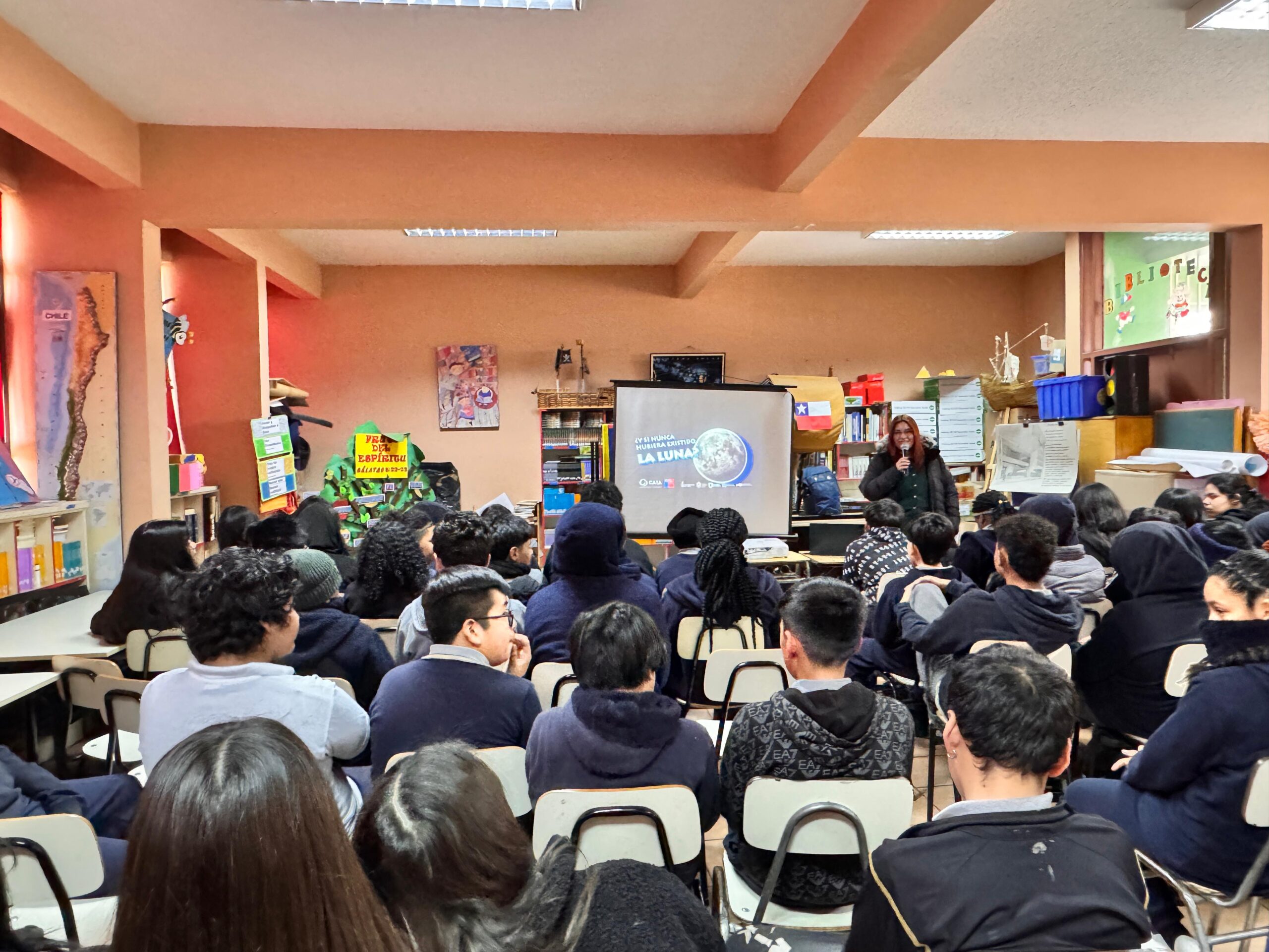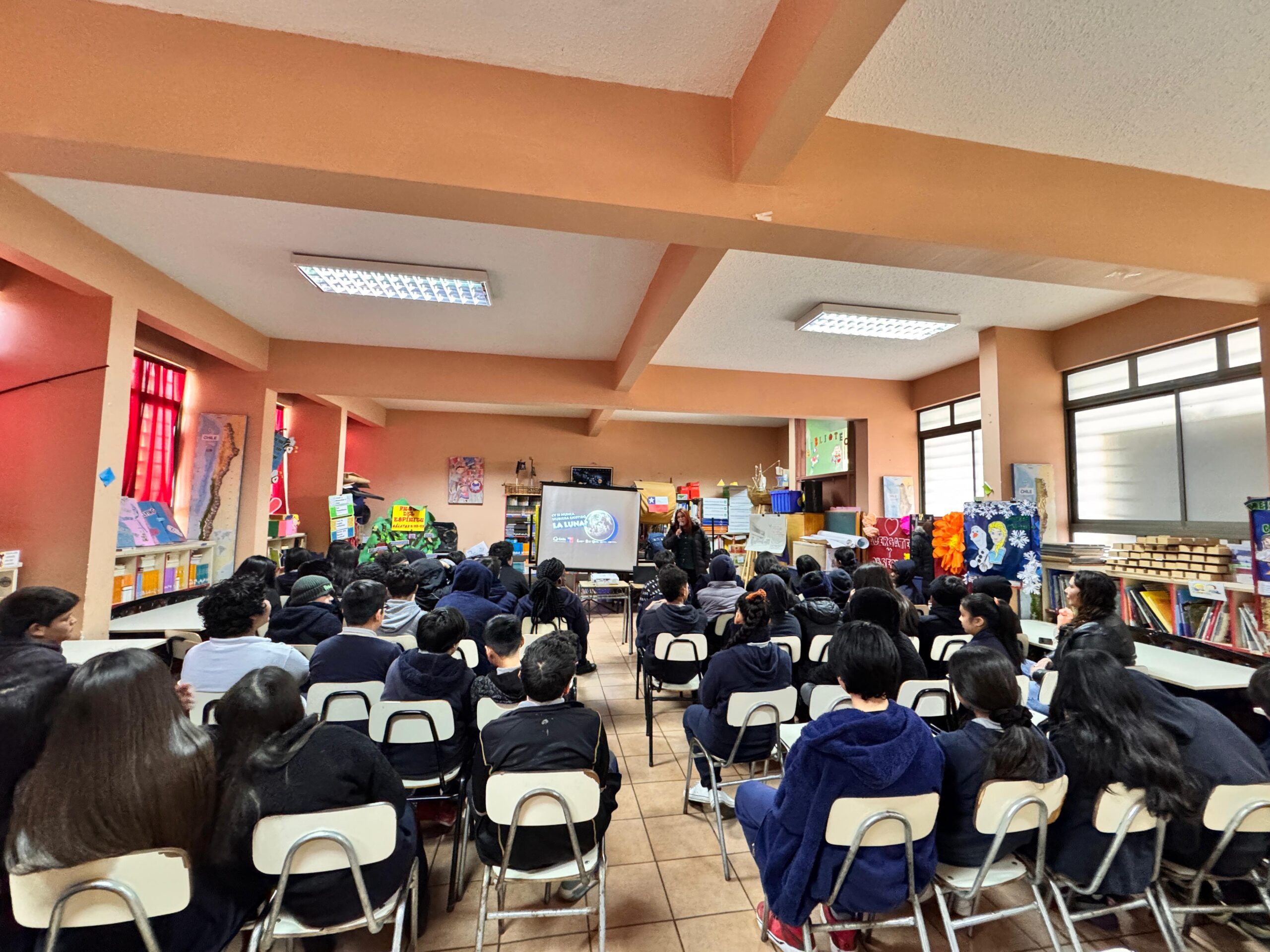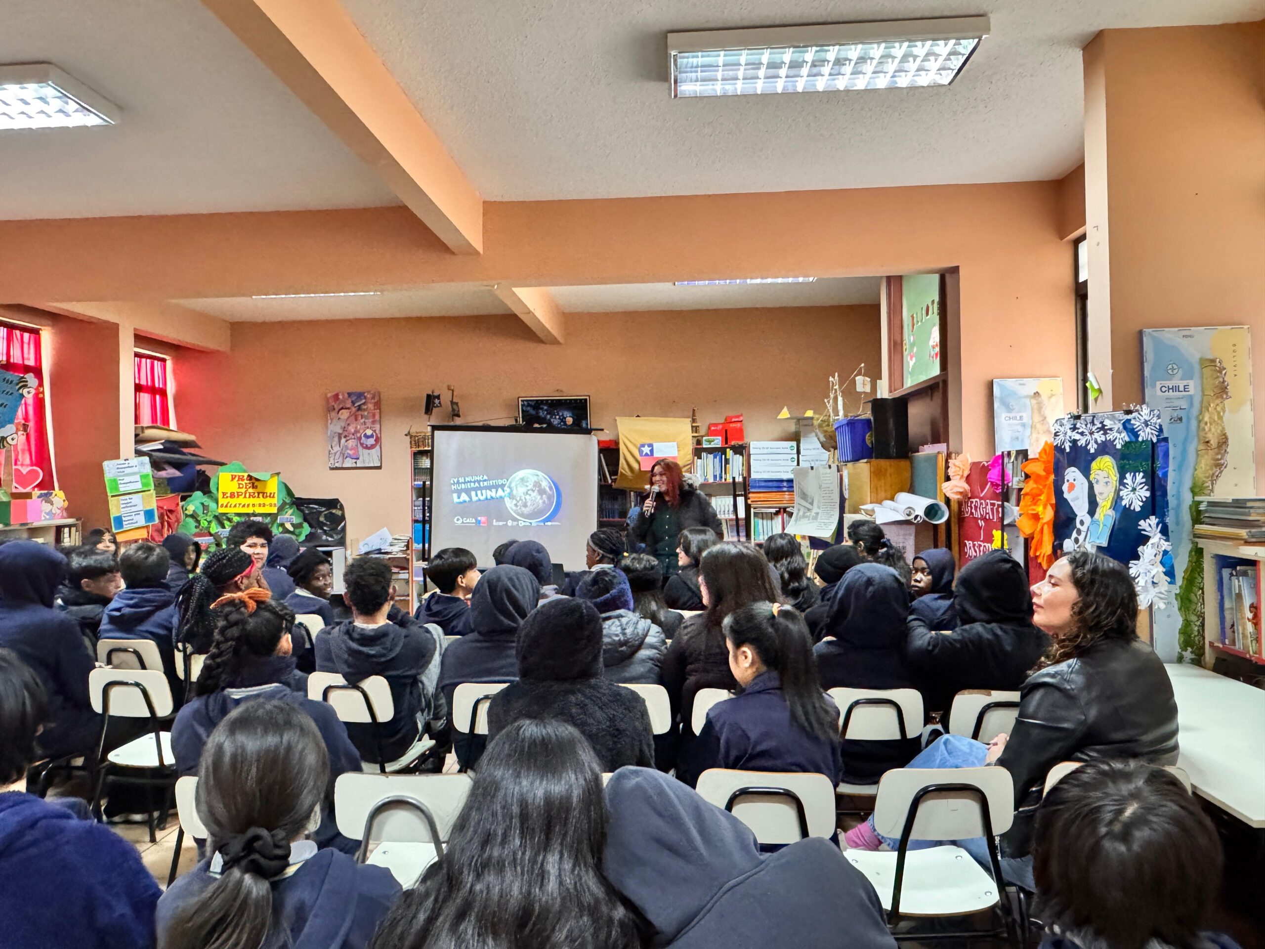 En el marco de su programa de divulgación científica, el Centro de Astrofísica y Tecnologías Afines (CATA) realizó la charla “¿Y si nunca hubiera existido la Luna?” en la Escuela El Salitre, ubicada en la comuna de Pudahuel. La actividad estuvo dirigida a estudiantes de enseñanza básica en dos bloques: el primero para alumnos de tercero, cuarto y quinto básico; y el segundo para estudiantes de séptimo y octavo año, logrando convocar a un total de 136 participantes.