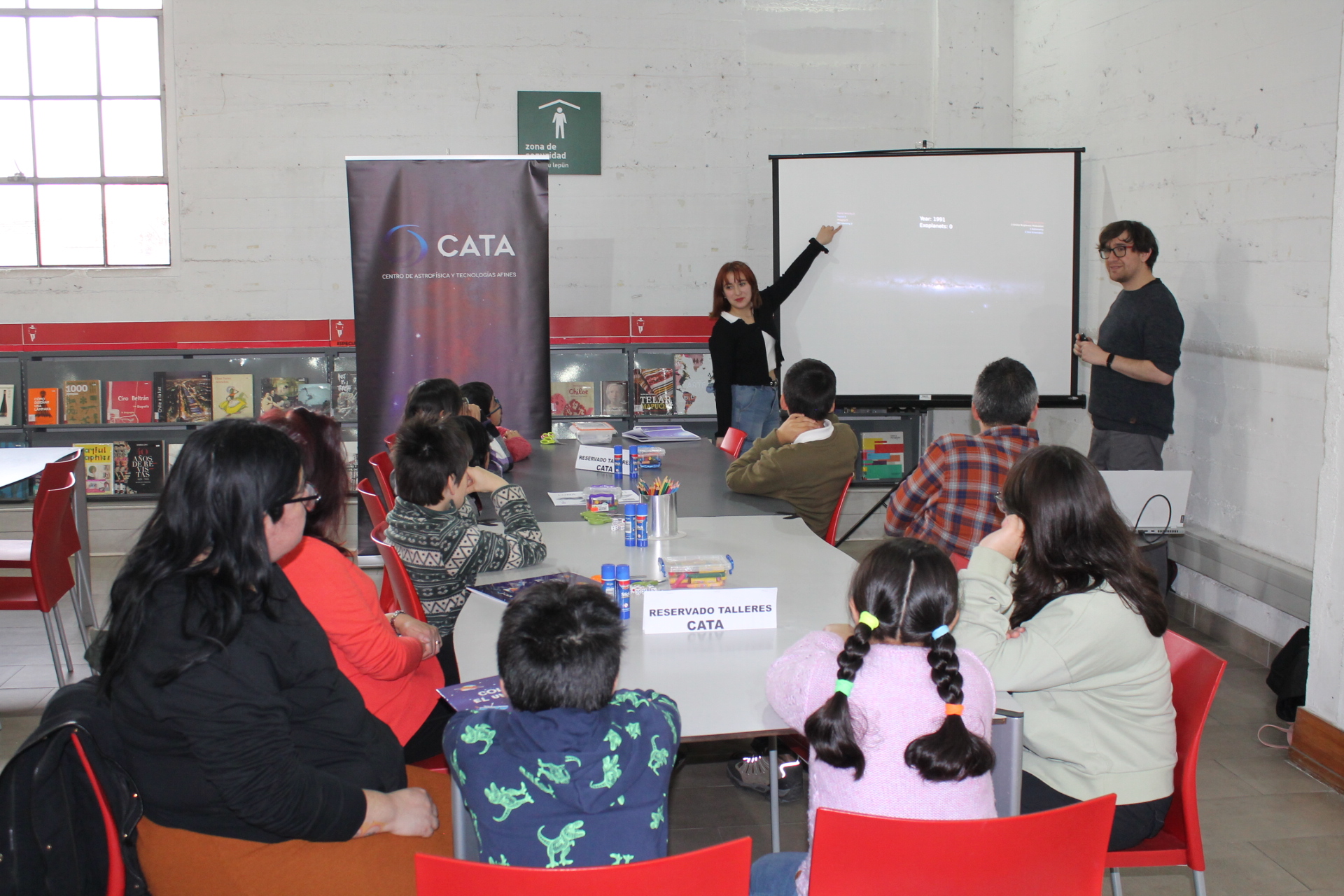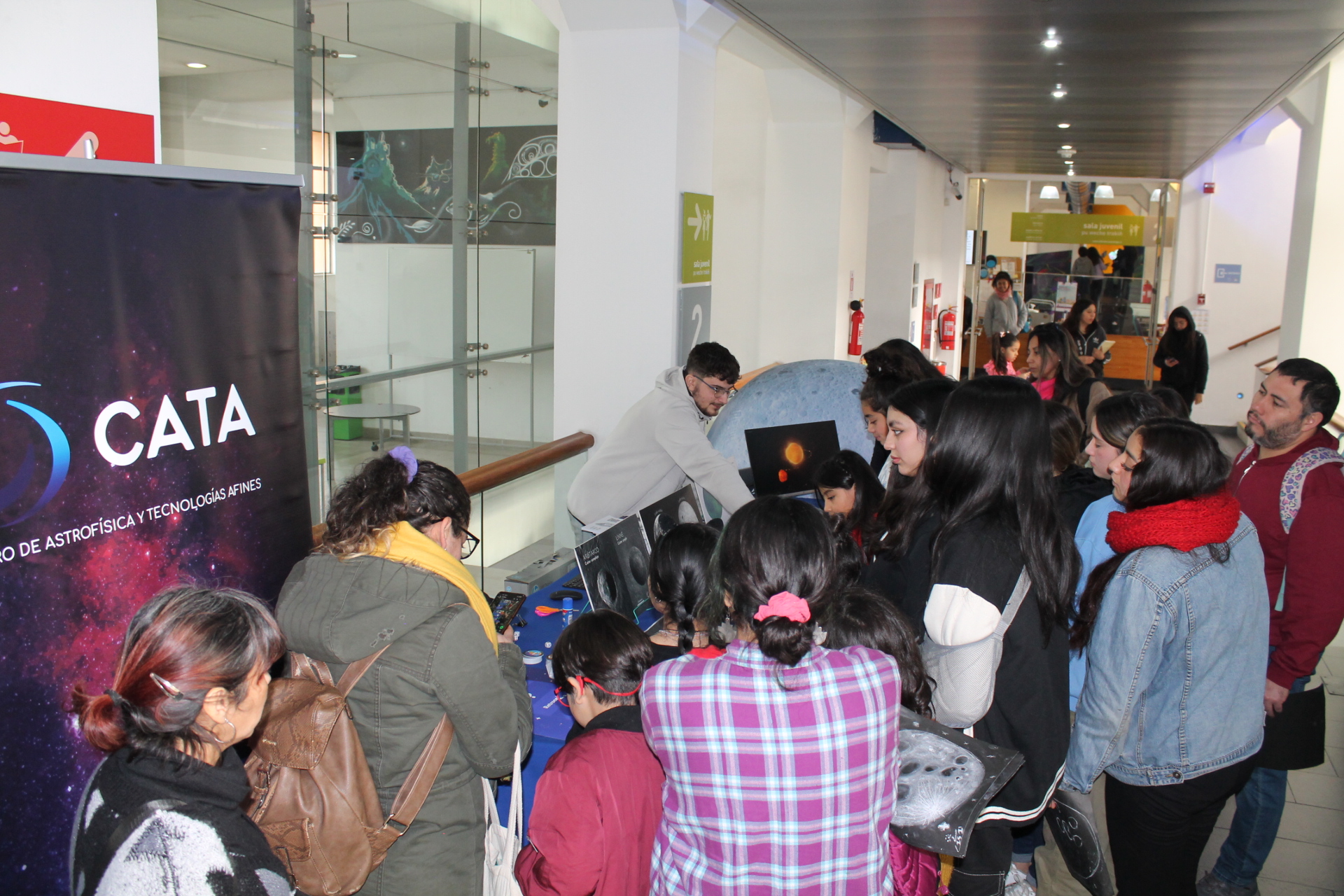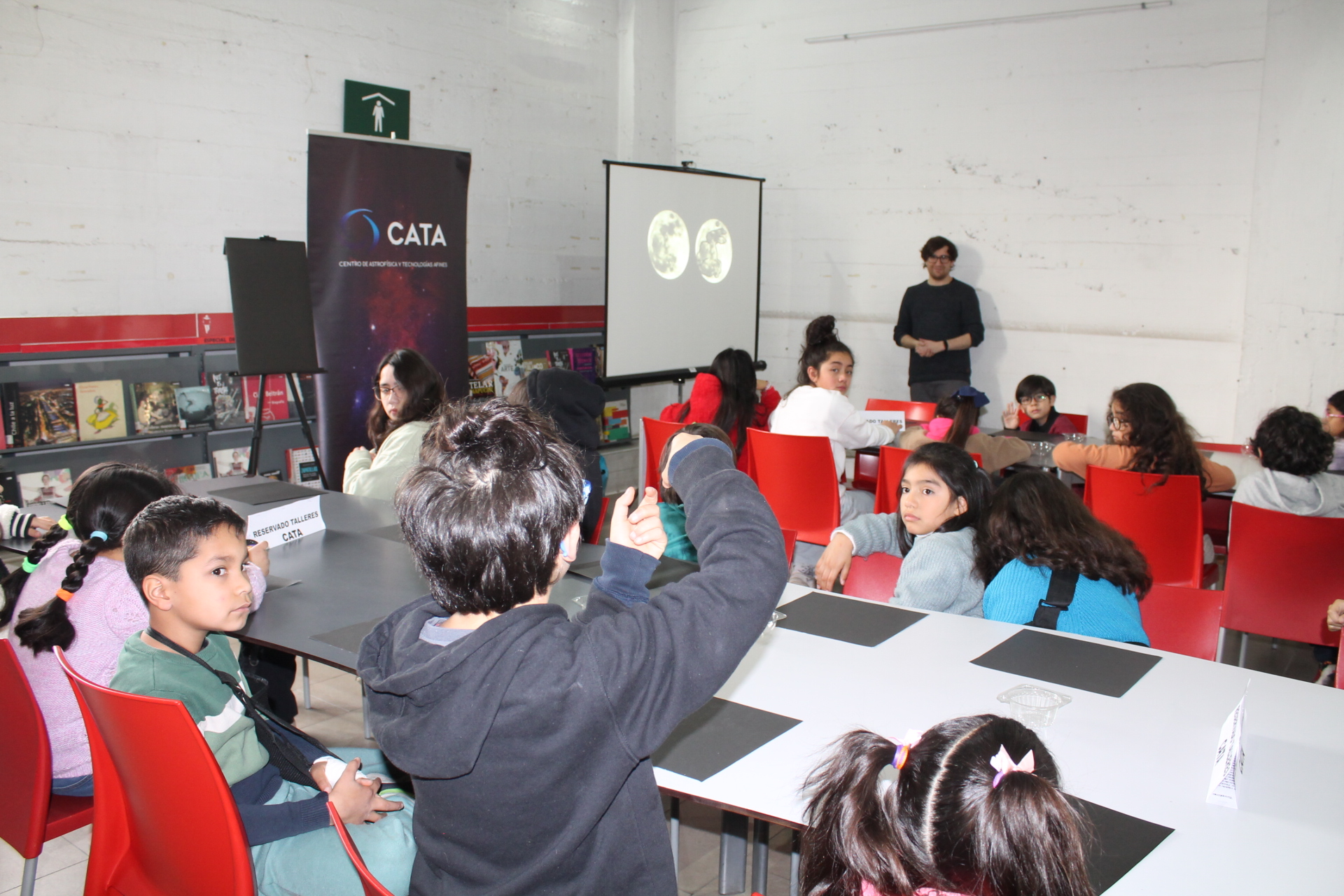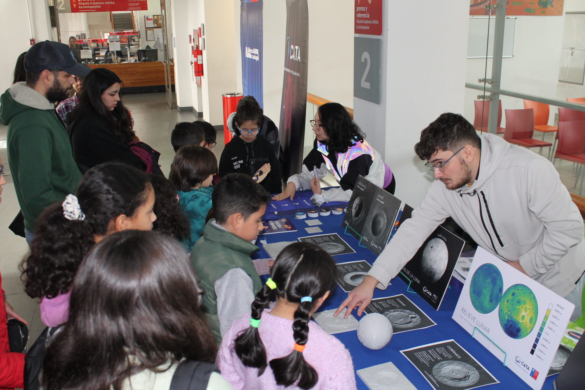 En paralelo, Paula Díaz y Vicente Woolvett, estudiantes de Magister en Astronomía de la Universidad de Chile, se instalaron con un stand de CATA donde lo visitantes a la Biblioteca de Santiago, a través de entretenidos juegos, pudieron dilucidar dudas como ¿por qué la luna tiene tantos cráteres?, ¿por qué hay una gran zona lisa en la superficie lunar? o ¿cómo se mantiene en órbita alrededor de la Tierra?. Además, de poder tocar modelos 3D de la Luna para notar sus particulares características.