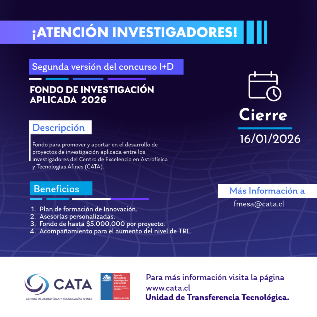 A través de su Unidad de Transferencia Tecnológica, el Centro de Astrofísica y Tecnologías Afines (CATA) realizó la apertura del Fondo de Investigación Aplicada (I+D) 2026 dirigido a profesores, investigadores y/o profesionales de las universidades asociadas al CATA.