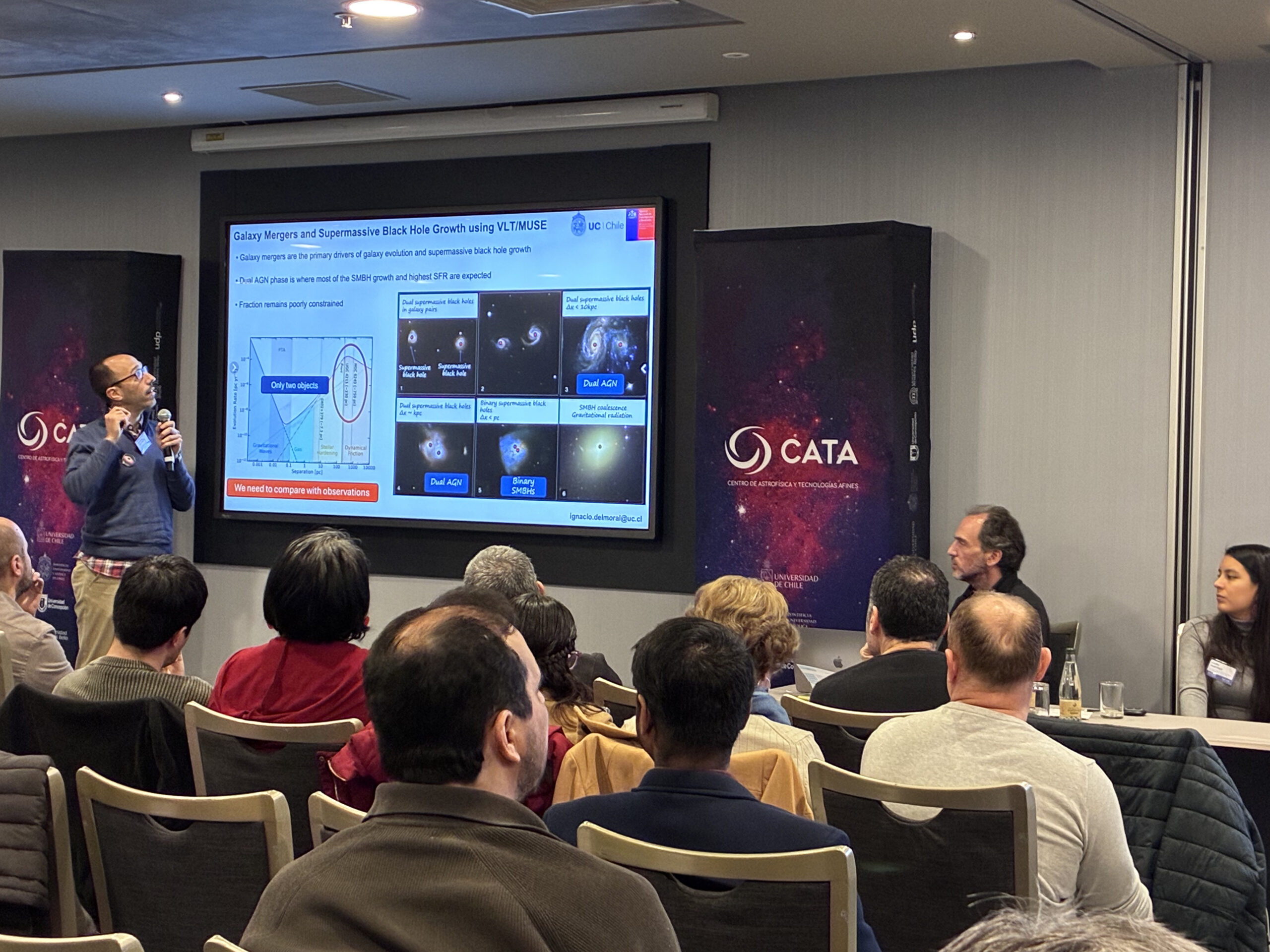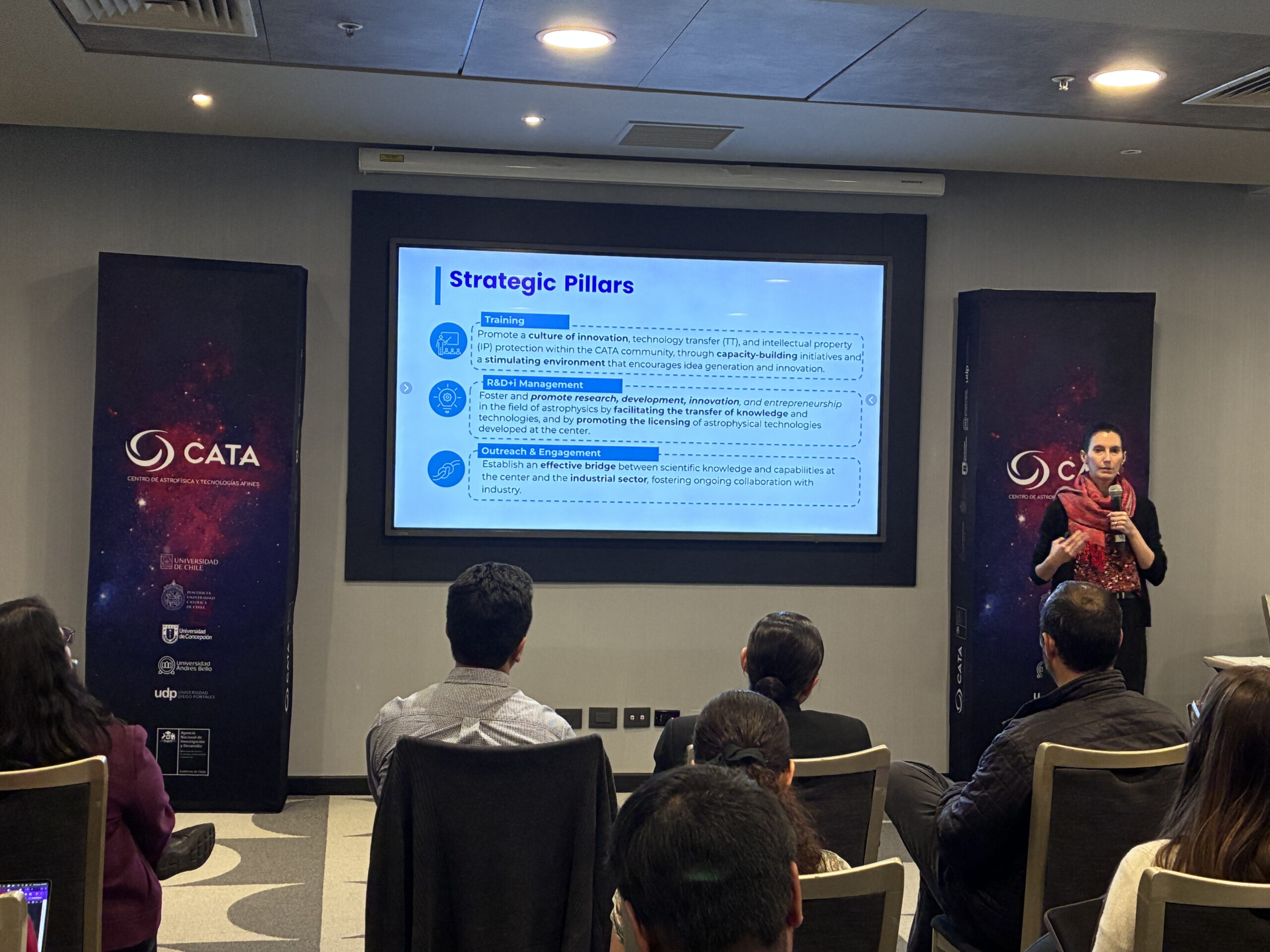 La jornada inaugural comenzó con la presentación del estado actual de CATA, a cargo de su Directora, Patricia Tissera y del Subdirector, Roberto Assef. Posteriormente, se realizó una sesión de highlights por áreas de investigación, dividida en dos bloques: el primero, dirigido por el Investigador Asociado, Timo Anguita (UNAB) la que abarcó las áreas 1 a 4 (Cosmología y Formación de Galaxias, Agujeros Negros Supermasivos, Galaxias, Universo Local), y el segundo, encabezado por la Investigadora Asociada, Bárbara Rojas-Ayala (UTA) la que convocó a las áreas 5 a 8 (Formación de Estrellas y Planetas, Exoplanetas y Astrobiología, Astrofísica Teórica, Instrumentación Astronómica).