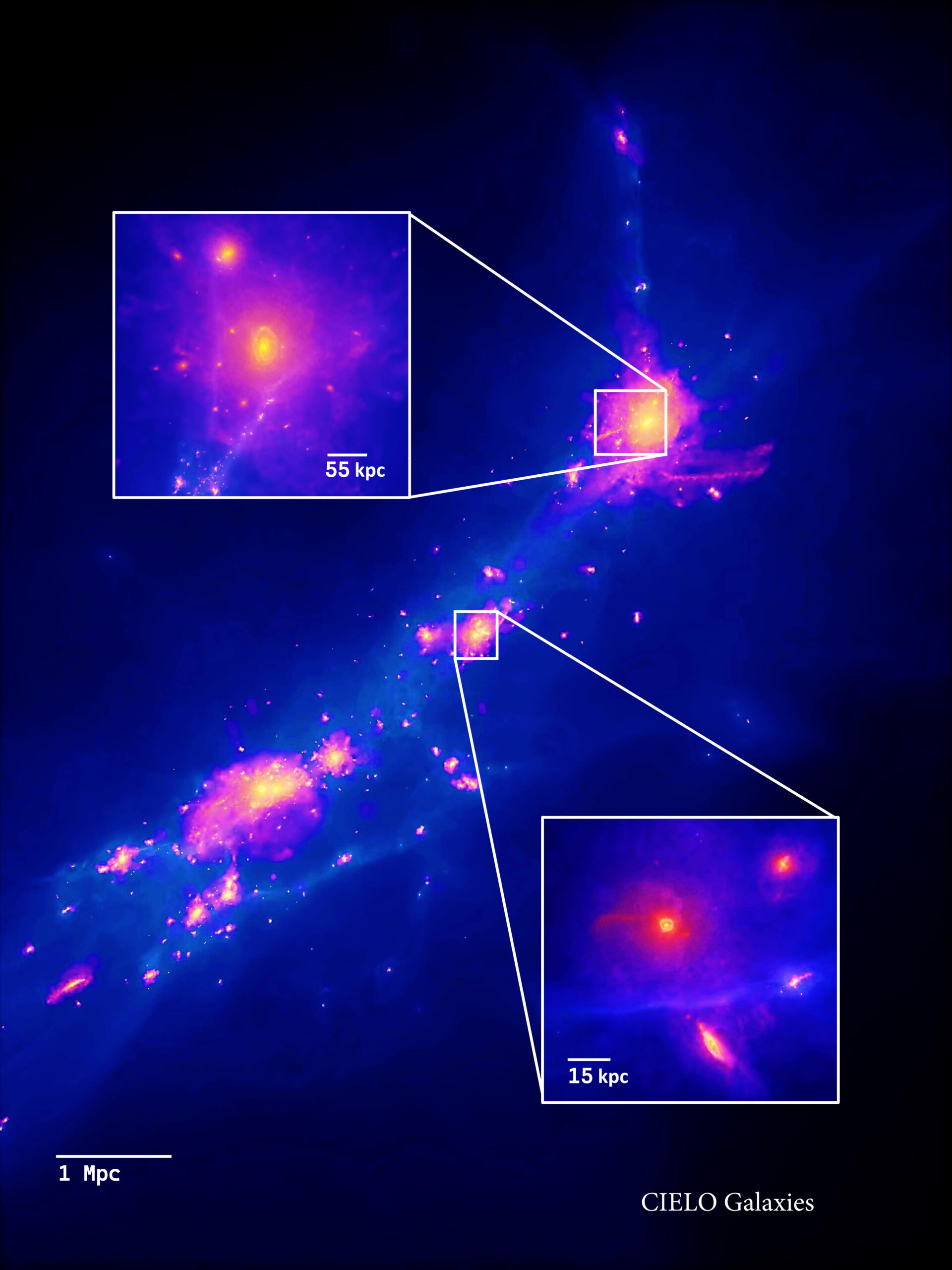 El objetivo de CIELO es entender cómo se forman y evolucionan las galaxias dentro de su entorno natural -la red cósmica- considerando sus propiedades químicas como huellas de esa evolución. La iniciativa busca dilucidar cómo distintos entornos (vacíos, filamentos, paredes cósmicas) influyen en la dinámica y composición de las galaxias, aportando nuevas claves sobre su formación y transformación a lo largo del tiempo.