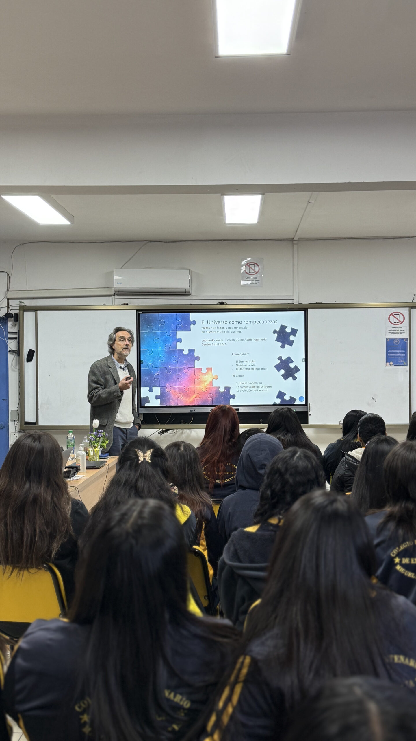 As part of its outreach program, the Center for Astrophysics and Associated Technologies (CATA) (ANID Basal Center) visited the Miguel de Cervantes Bicentennial School of Excellence in the municipality of La Cisterna. Leonardo Vanzi, Associate Researcher at our Center and professor at the Catholic University, gave a talk. “The Universe as a puzzle: pieces that are missing or don’t fit into our vision of the cosmos.” The activity was attended by 56 students, mainly from secondary schools.