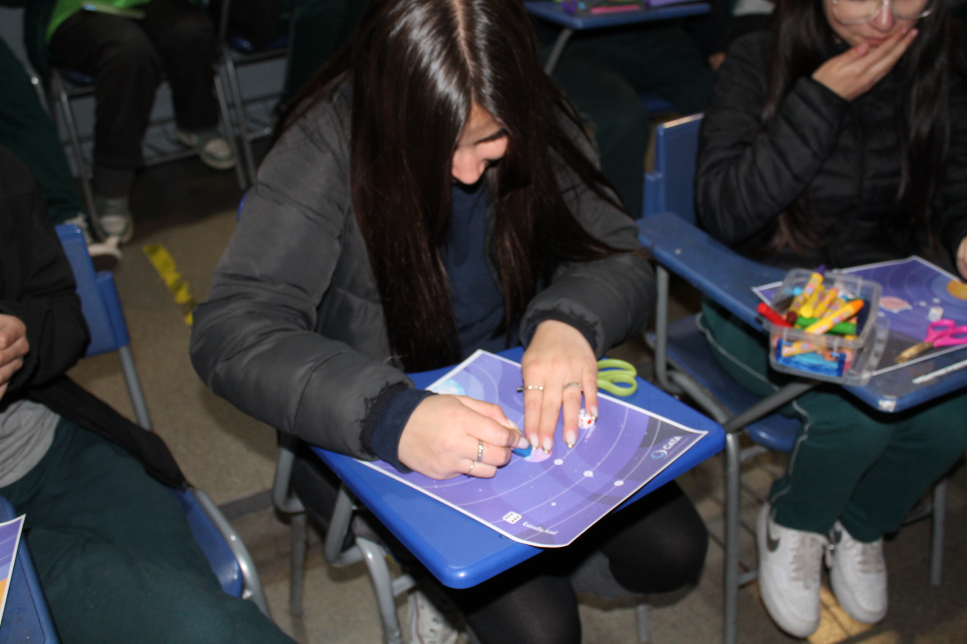 The meeting at the Alcántara School continued with a workshop on exoplanets, where eighth grade students randomly created their own planetary systems based on a red, yellow or blue star and saw the consequences that this configuration gave to each of their planets. In this way they were also able to understand how special our own solar system is. This activity was directed by José Utreras and Catalina Vargas, Master’s student in Astronomy at the University of Chile and member of CATA.