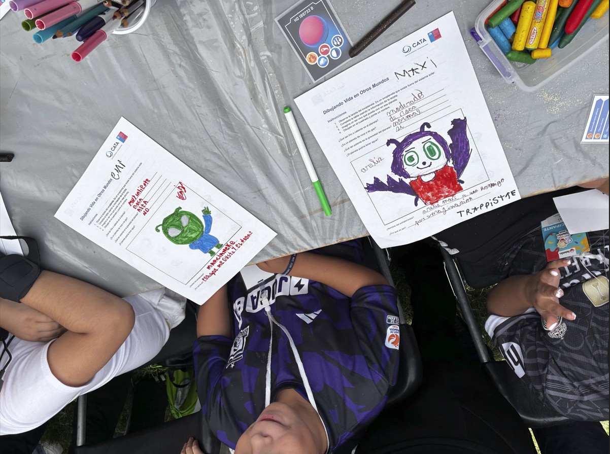 The activity, held at the Police Research School (PDI School), was part of a series of rotating workshops within the program, aimed at recreation, strengthening teamwork, and developing social skills. On this occasion, CATA held two astronomy workshops, where children were able to explore astronomical concepts up close, stimulating creativity and curiosity about the universe from a playful and inclusive perspective.