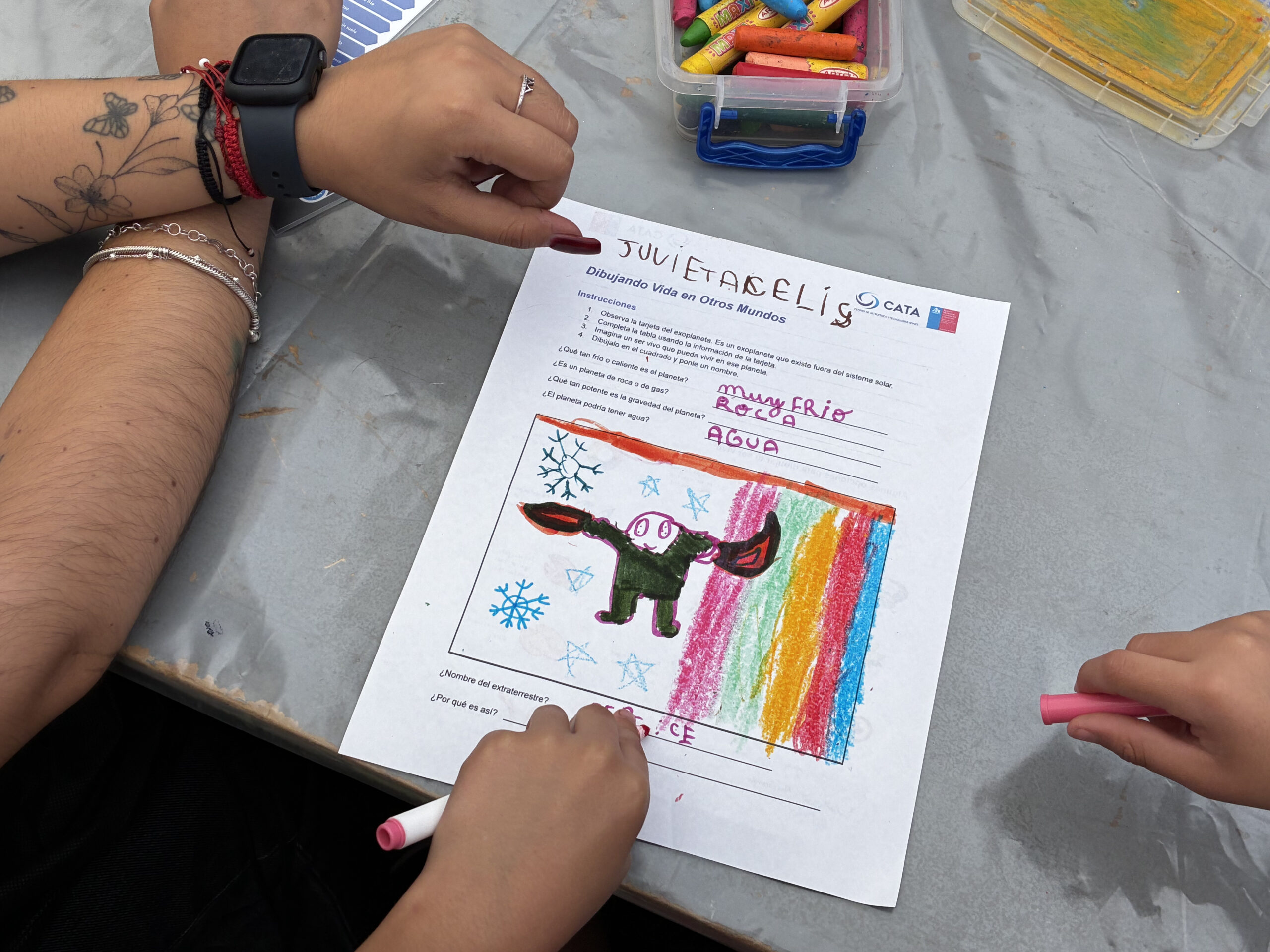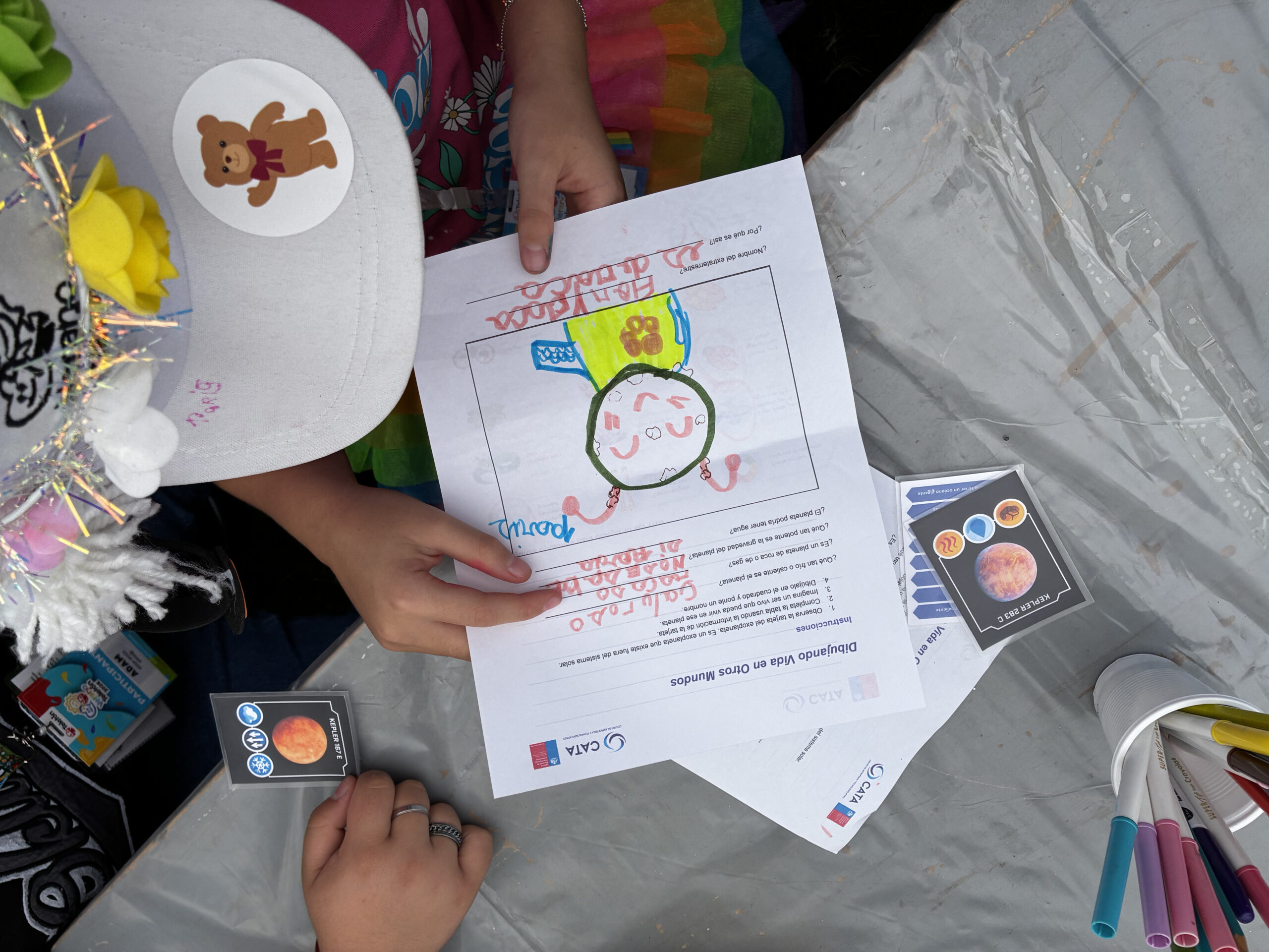 The second workshop, “Draw Your Alien,” invited children to imagine life forms that could inhabit some of the more than 6,000 exoplanets discovered so far. In this activity, each child received a card with information about an exoplanet and its properties, which served to reflect on the diversity of planets outside the Solar System and the conditions necessary for life or adaptation in different environments, resulting in a variety of creative sketches made by the participants themselves.