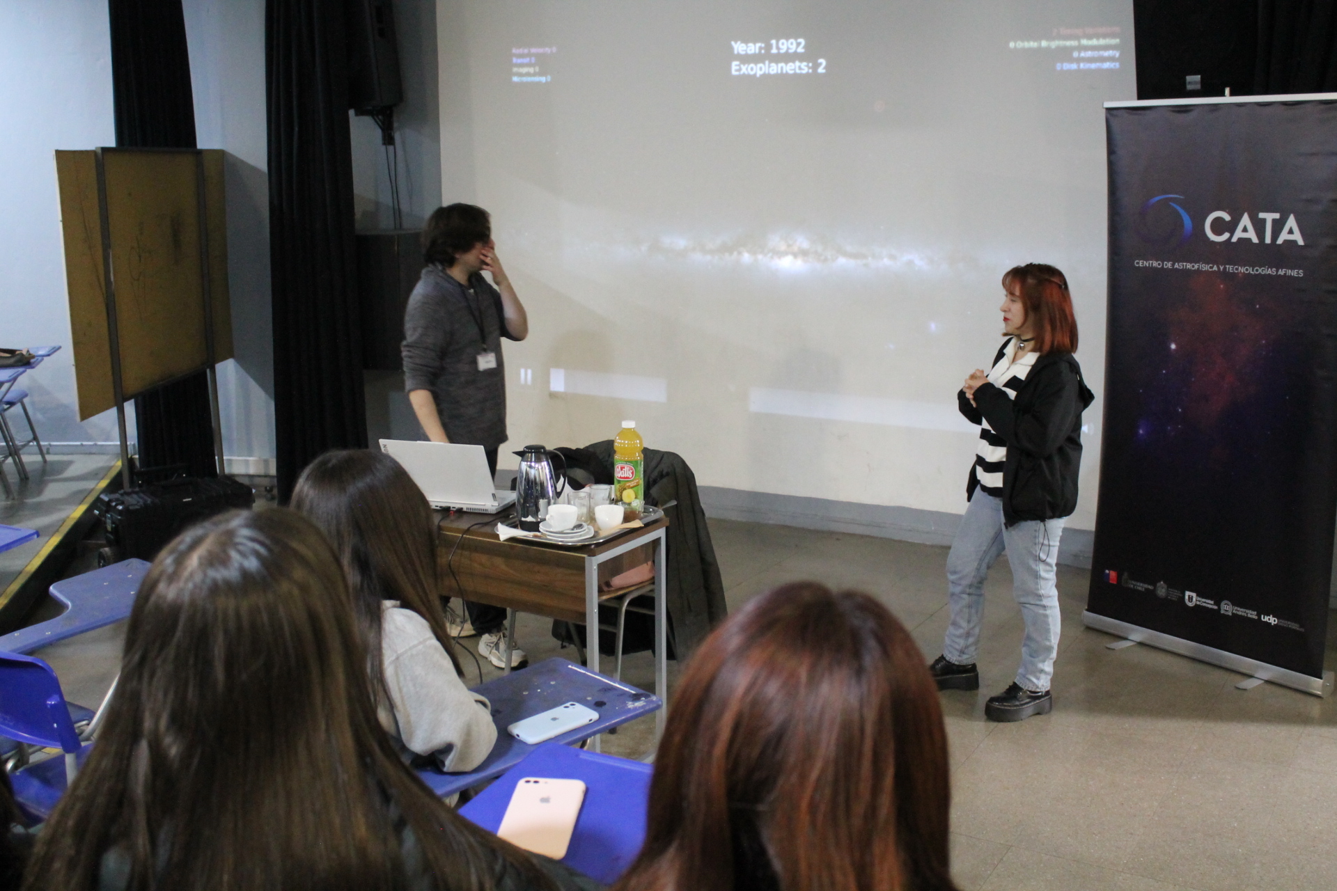 “La invitación fue abierta para estudiantes de tercero y cuarto medio y tuvimos mucha asistencia. Uno tiende a pensar que son un poco reacios, como que no tienen mucho interés, pero realmente se notó que estaban muy metidos en el tema y hasta me sorprendieron con algunas cosas que sabían o la profundidad de las preguntas. Creo que también la forma en que los astrónomos del CATA llevaron la charla fue súper buena, porque hicieron una bajada interesante y comprensible. Es una temática difícil de entender muchas veces, y creo que fue atrayente para ellos también”, comentó la profesora Moira Díaz.