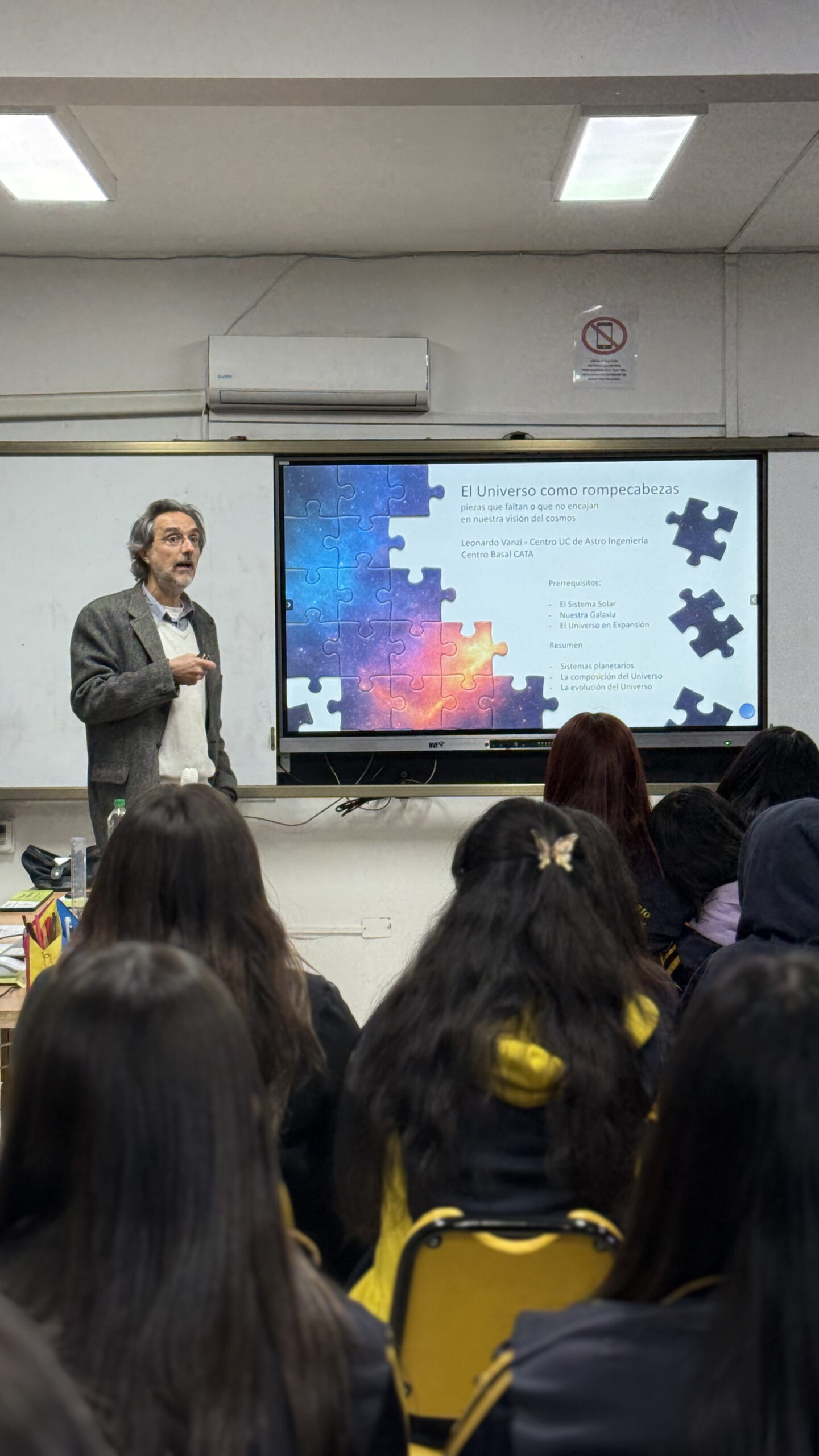 En el marco de su programa de divulgación, el Centro de Astrofísica y Tecnologías Afines – CATA (Centro Basal de ANID) asistió al Colegio Bicentenario de Excelencia Miguel de Cervantes, de la comuna de La Cisterna. Leonardo Vanzi, Investigador Asociado de nuestro Centro y académico de la UC presentó la charla “El Universo como rompecabeza: piezas que faltan o que no encajan en nuestra visión del cosmos”. La actividad contó con la participación de 56 estudiantes, principalmente de enseñanza media.