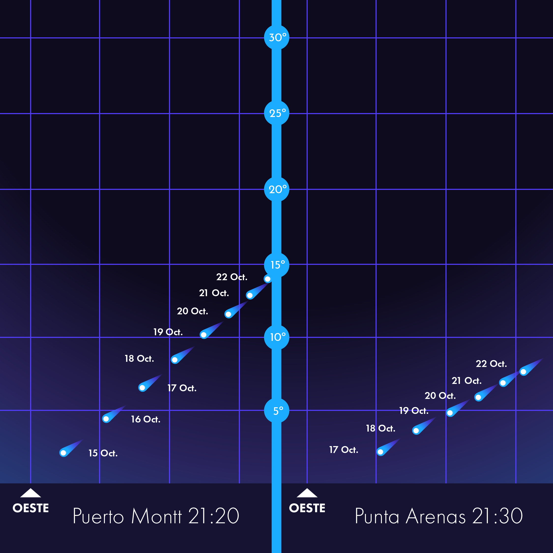 En esta segunda etapa, el Tsuchinshan-ATLAS se podrá ver entre el 13 y 22 de octubre, a partir de las 20:30 o 21:00, dependiendo de la zona del país. Al comienzo se apreciará levemente sobre el horizonte y, con el pasar de los días, ira subiendo hasta ubicarse por sobre los 15 grados, siempre mirando hacia el horizonte.